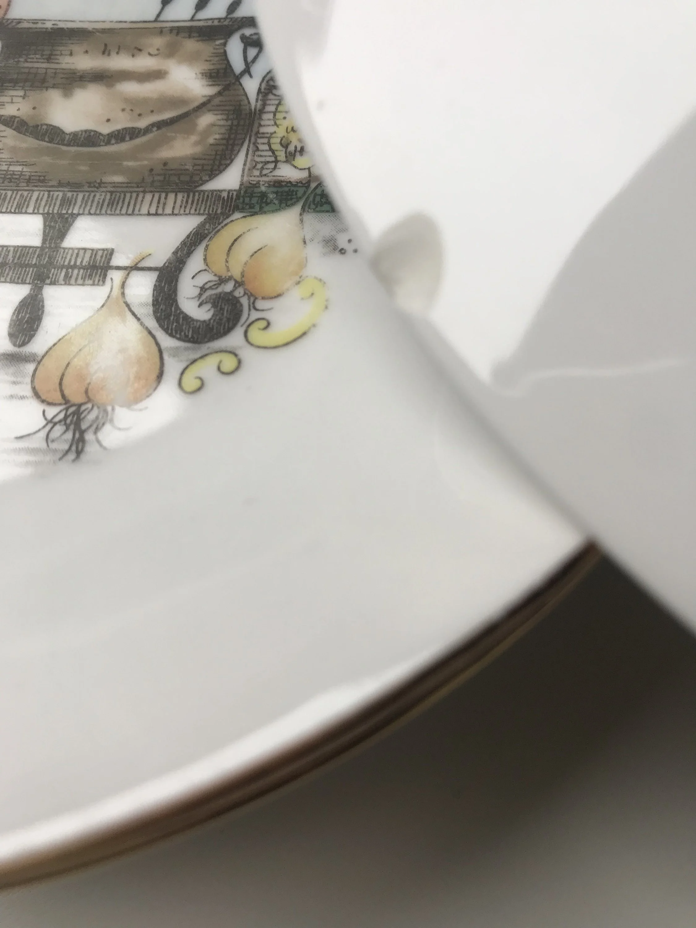 Set of 6 vintage fondue theme plates with gold trim. Diameter 20 cm Made in East Germany, by Kahla One plate has a tiny chip on the underside (see photo)