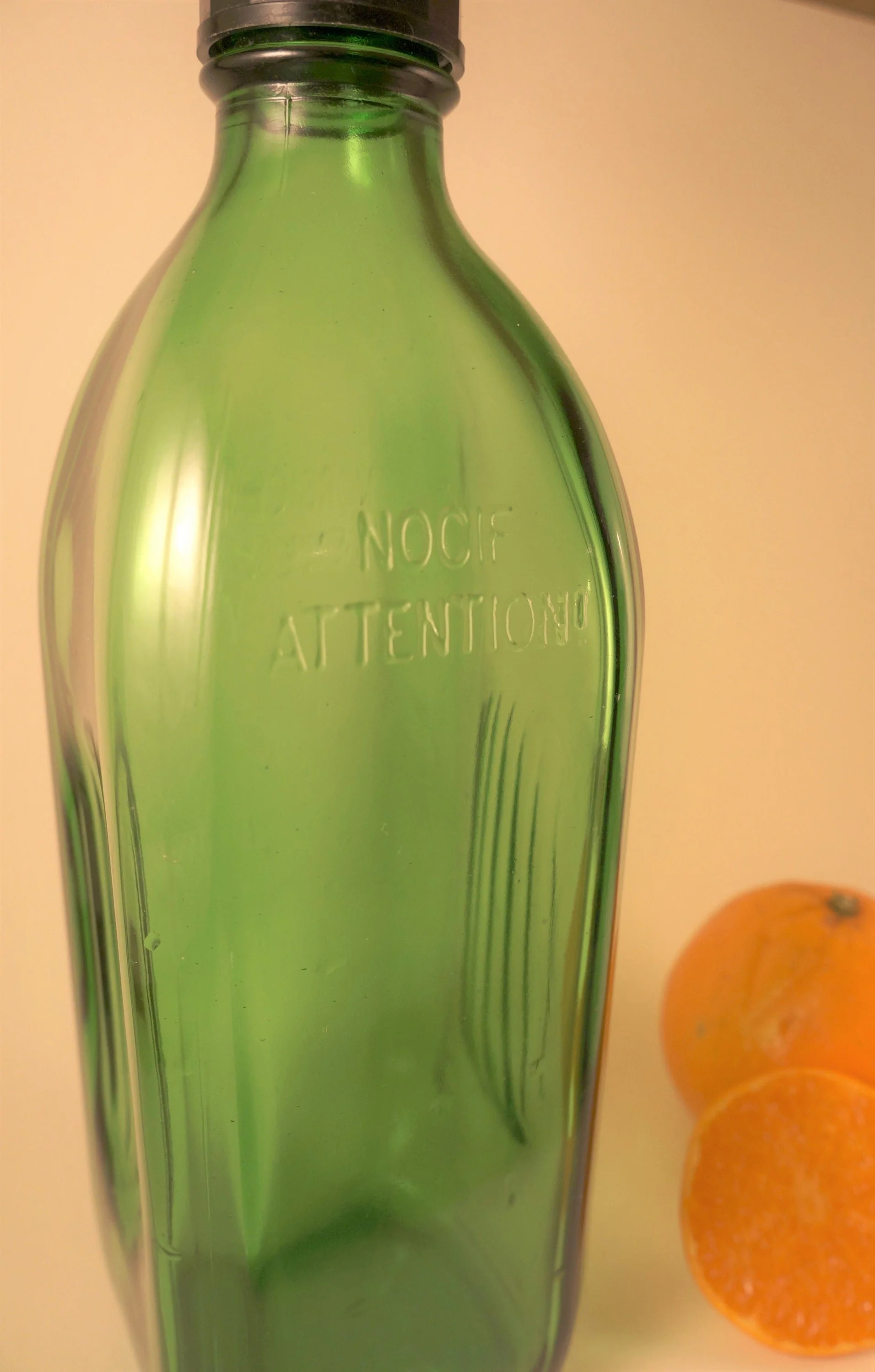 Vintage Pharmacy Bottle in glass marked on either side with "Vorsicht Ungenießbar" and "Nocif Attention" which translates to "Caution Harmful" in German and French. Makes interesting conversation starter and decorative element to a bar or table.